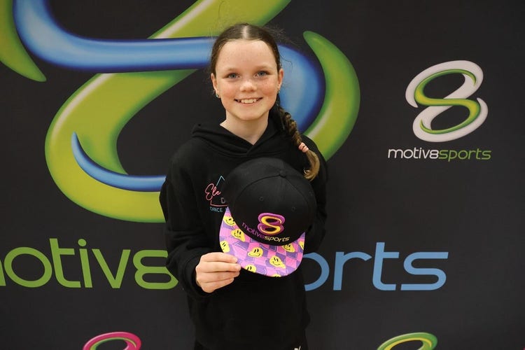 Evie was presented with a prototype of her hat - the national winner of the 2025 Motiv8sports Design-A-Hat Competition - and received a standing ovation from more than 300 kids and parents at the closing ceremony.